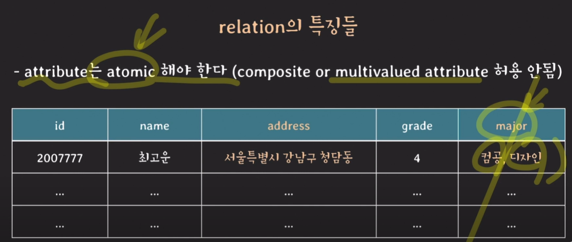 - attribute는 atomic해야 한다 (composite or multivalued attribute 허용 안됨)