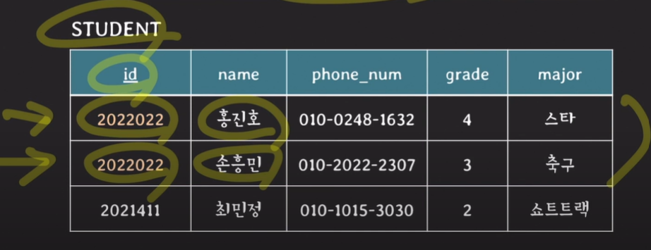 - entity integrity constraint: primary key는 value에 NULL을 가질 수 없다 (primary key는 tuple을 unique하게 식별하기 위해 사용되는 key인데, value가 NULL이 될 수 있다면 더 이상 tuple을 unique하게 식별할 수 없게 됨)