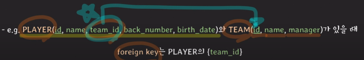 foreign key: 다른 relation의 PK를 참조하는 attributes set
