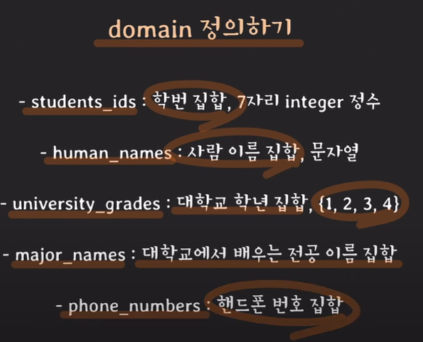 - domain: 값들의 집합, 각 domain에 이름 붙일 수 있음
