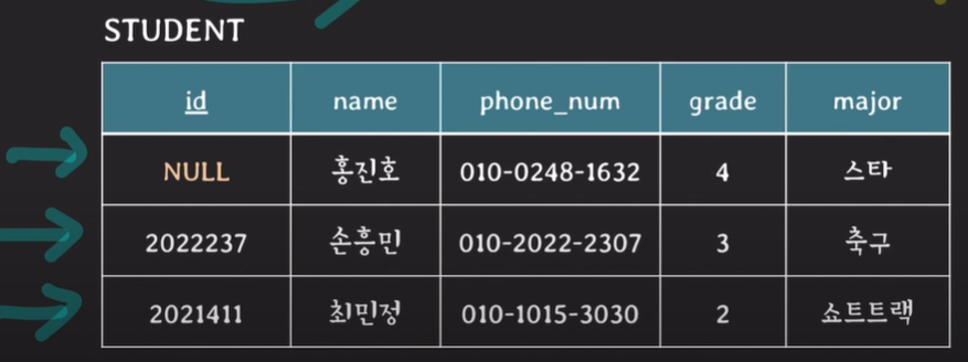 -> NULL은 중의적인 의미를 가짐. NULL 하나로 여러가지 의미가 표현되기에 최대한 NULL을 쓰지 않는 것이 좋음