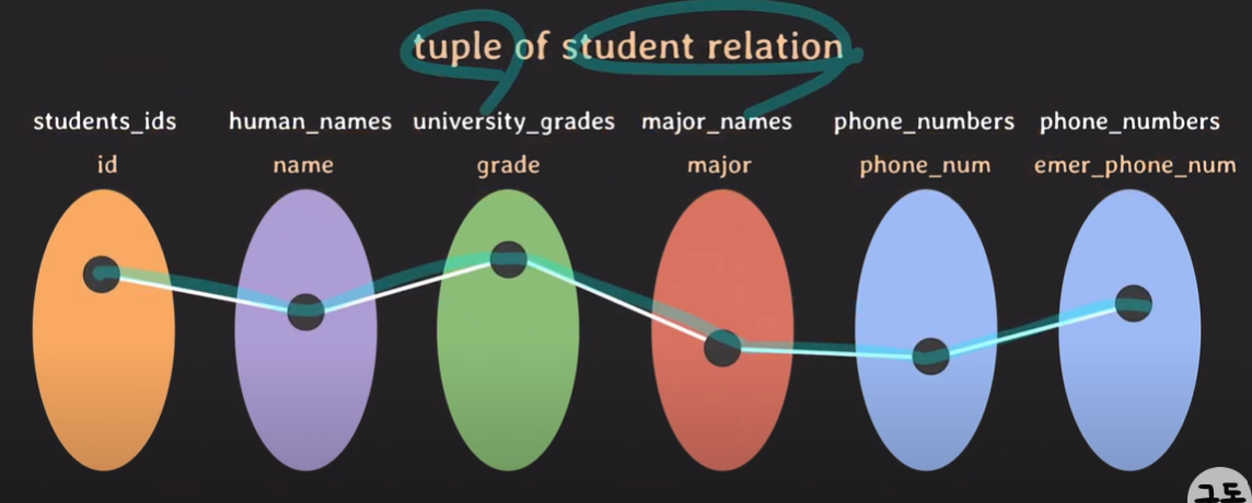 - tuple: attribute 각각의 값들로 이루어진 리스트