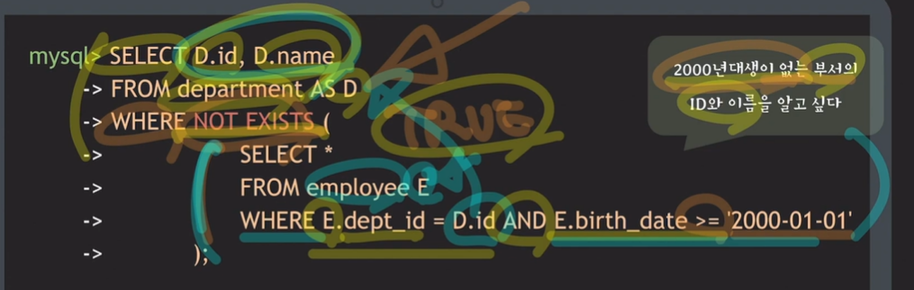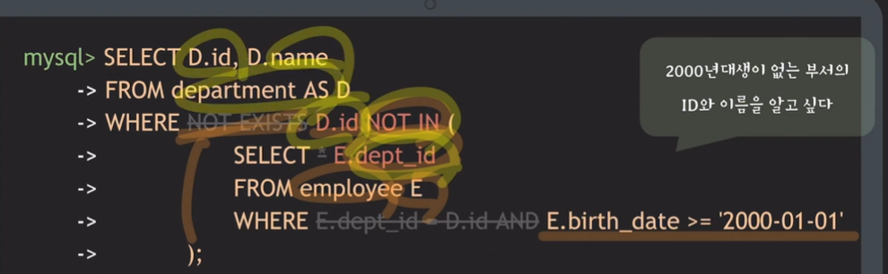 • 2000년대생이 없는 부서의 ID와 이름을 알고 싶음 (NOT EXISTS 사용)