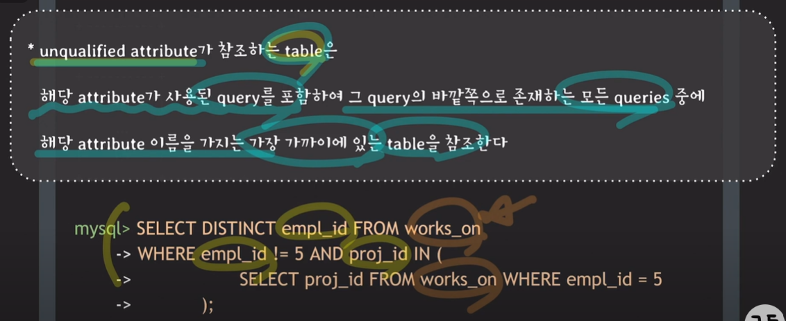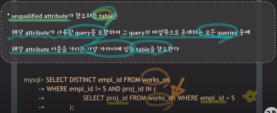 * unqualified attribute가 참조하는 table은 해당 attribute가 사용된 query를 포함하여 그 query의 바깥쪽으로 존재하는 모든 queries 중에 해당 attribute 이름을 가지는 가장 가까이에 있는 table을 참조한다