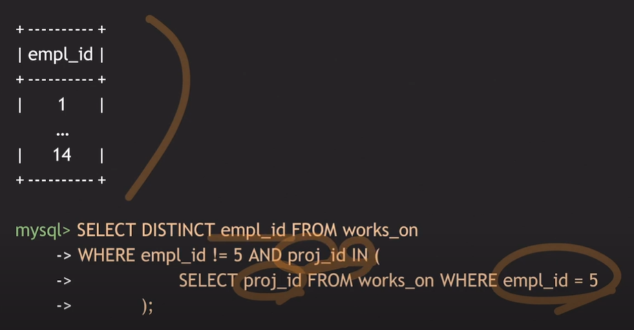 • employee의 id와 subquery의 결과로 만들어진 가상의 table에 있는 empl_id, 이 두 개가 같은 경우에 employee의 id와 name을 반환한다는 의미.