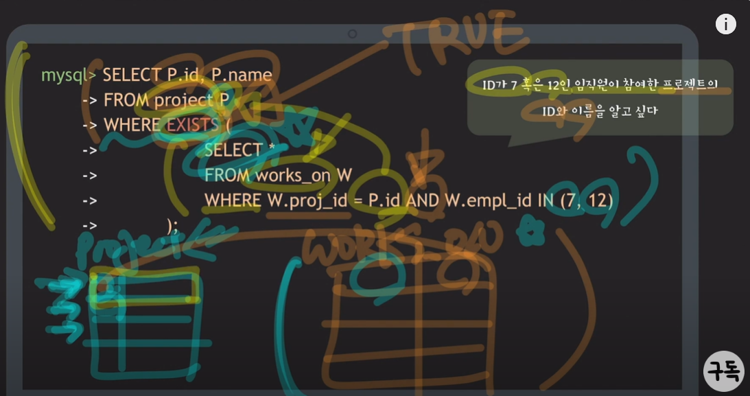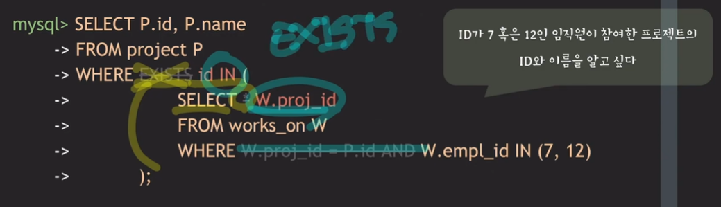 • ID가 7 혹은 12인 임직원이 참여한 프로젝트의 ID와 이름을 알고 싶음 (EXISTS 키워드를 사용)