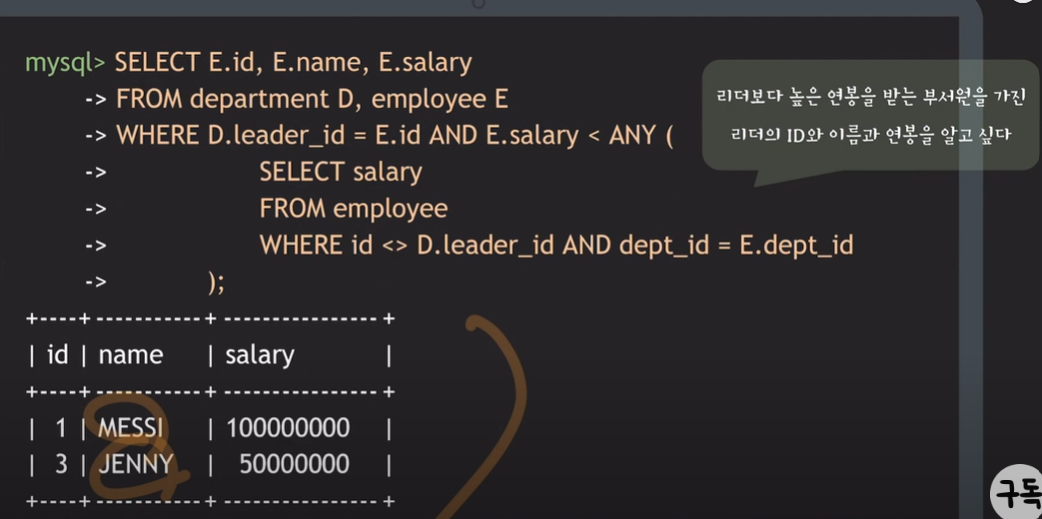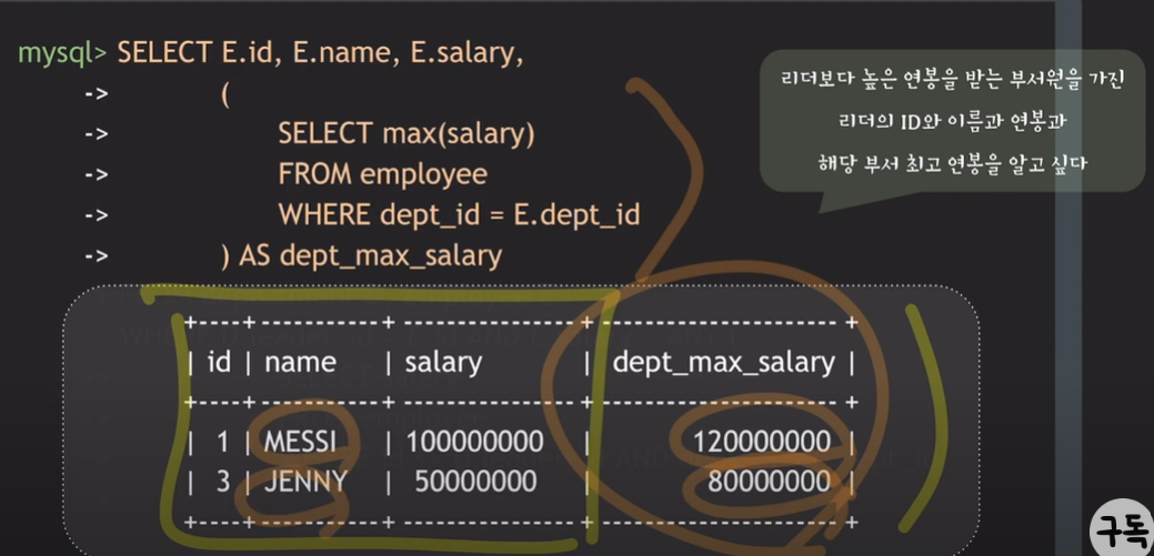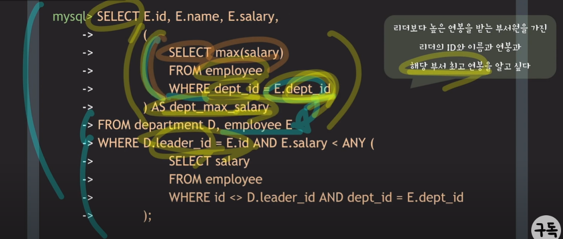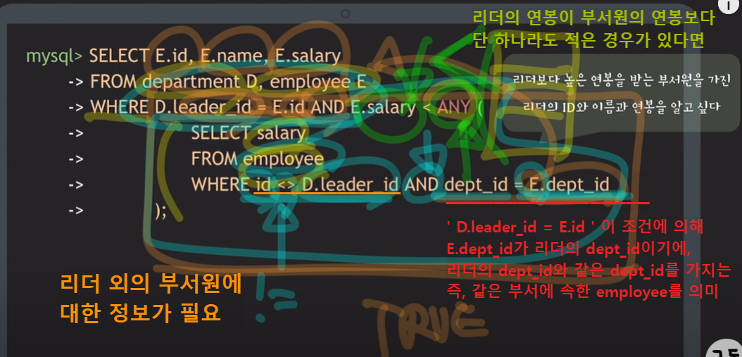 • 리더보다 더 많은 연봉을 받는 부서원이 부서에 존재하는지의 여부를 찾아야 함. (subquery 부분)