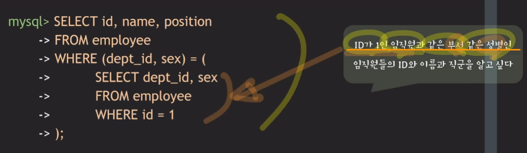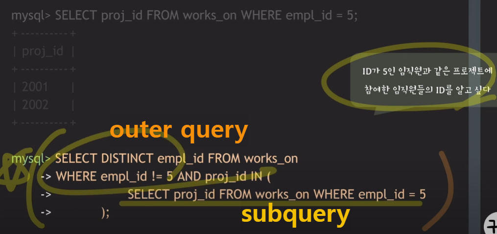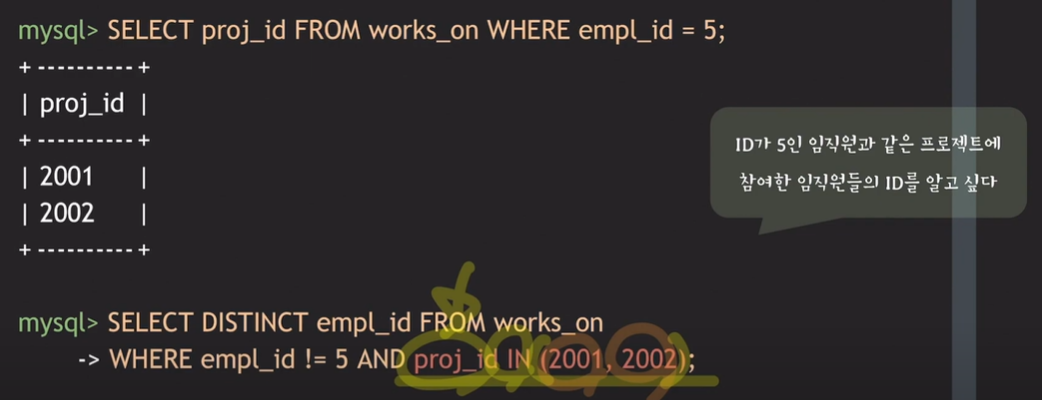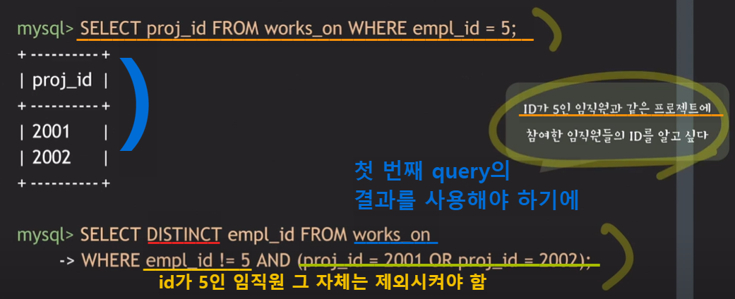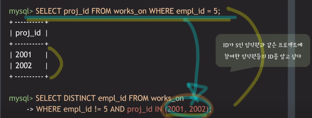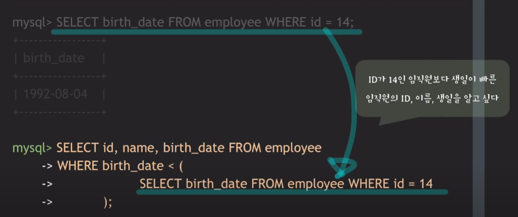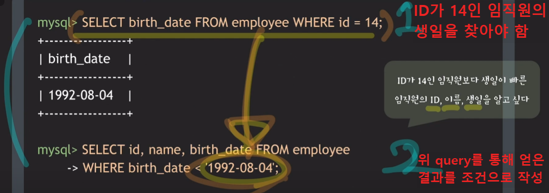 • 즉, 위 그림과 같이 첫 번째 query를 두 번째 query의 조건 부분에 넣으면 됨