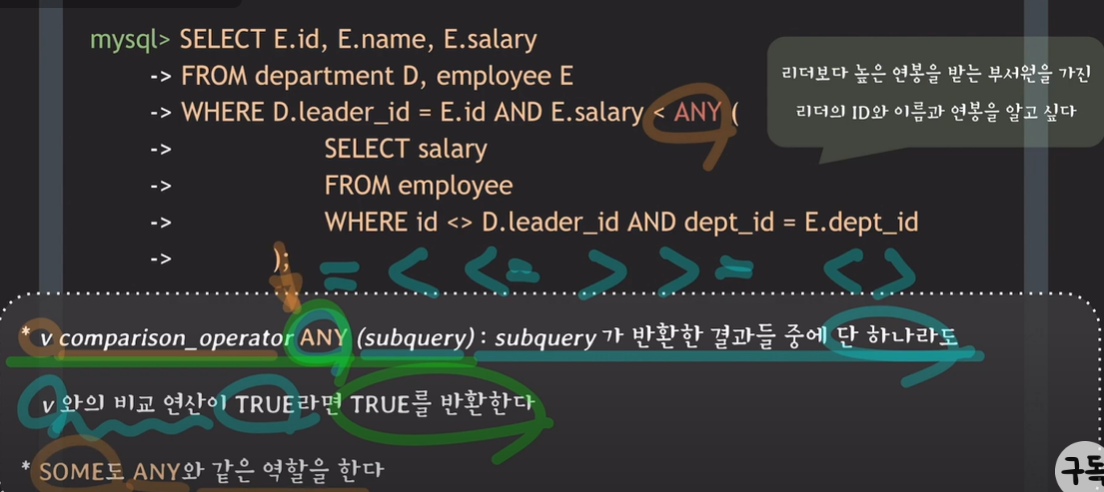 * v comparison_operator ANY (subquery) : subquery가 반환한 결과들 중에 단 하나라도 v와의 비교 연산이 TRUE라면 TRUE를 반환한다.
