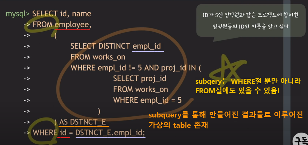 • 실제 존재하는 employee table과 subquery를 통해 나온 결과들로 이루어진 가상의 table인 DISTNCT_E