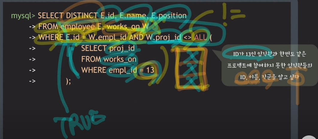 * NOT EXISTS: subquery의 결과가 단 하나의 row도 없다면 TRUE를 반환