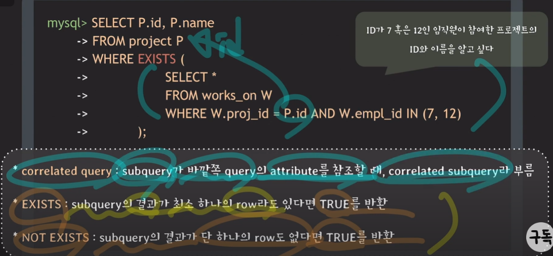 * correlated query : subquery가 바깥쪽 query의 attribute를 참조할 때, correlated subquery라 부름