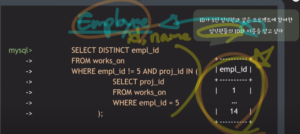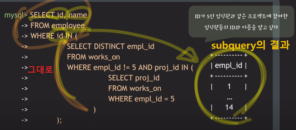 • subquery의 결과를 바탕으로 employee table에서 employee의 id가 결과에 있는 값들 중에 하나의 id와 같다면, 그때 그 id와 name을 가져오면 된다는 의미.