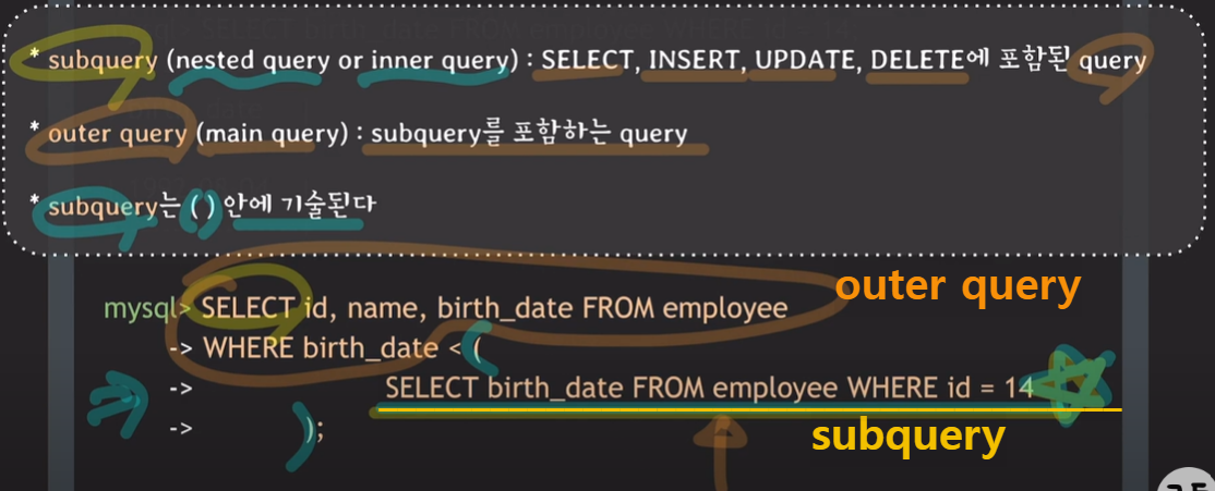 * subquery (nested query or inner query) : SELECT, INSERT, UPDATE, DELETE에 포함된 query