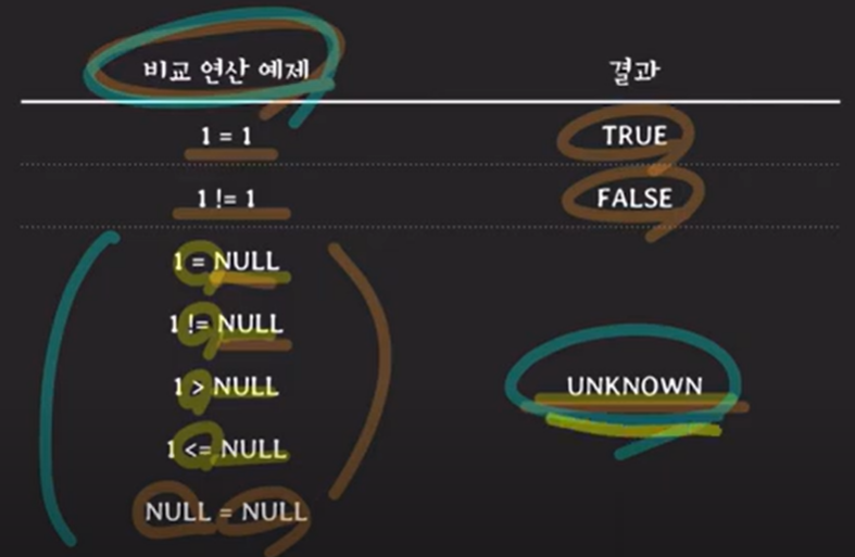 - 비교 연산을 수행할 때, 어느 한쪽에 NULL이 있으면 그 결과는 무조건 UNKNOWN이 된다.