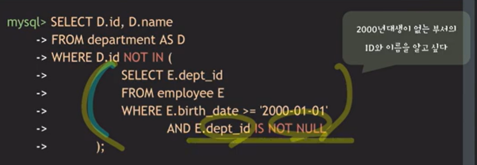 - subquery에서 dept_id가 NOT NULL인 경우를 CHECK해서 subquery가 return하는 값이 NULL을 포함하지 않도록