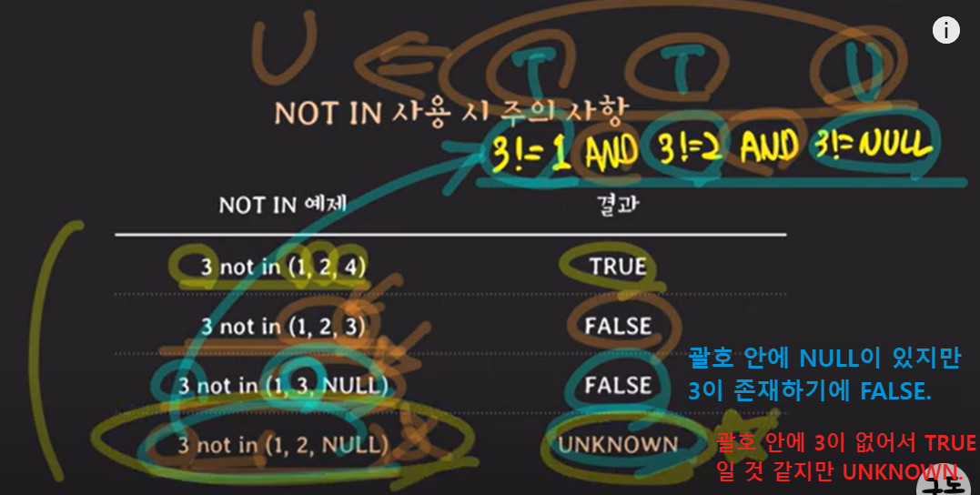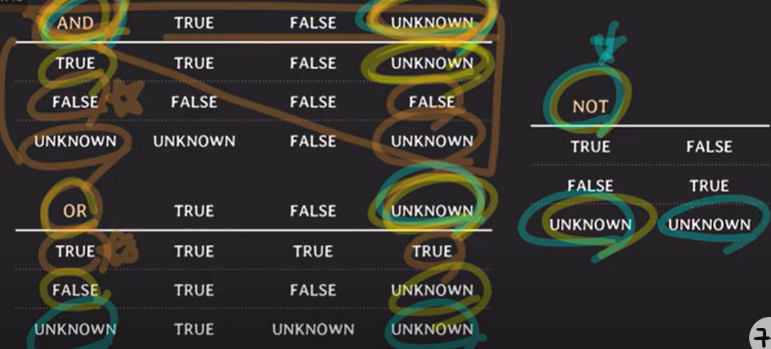 - 논리 연산을 수행할 때, UNKNOWN이 포함되면 어떤 결과가 나올지 잘 알아두어야 함!