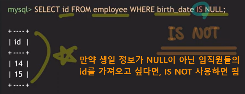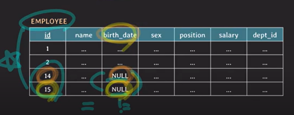- id가 14, 15인 두 임직원의 생일이 둘 다 NULL이라고 해서 '두 분의 생일이 동일하다' 이렇게 볼 수 없음.