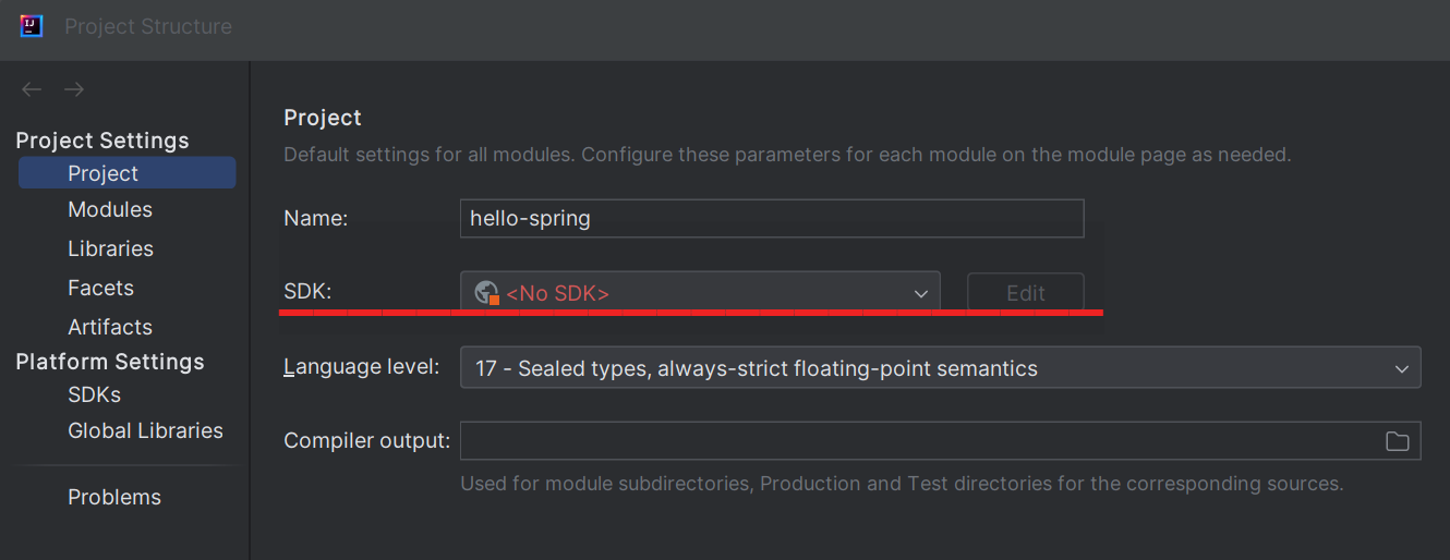 오류가 발생하게 된 원인: IntelliJ 초기 설정시 jdk 세팅을 안 해줌