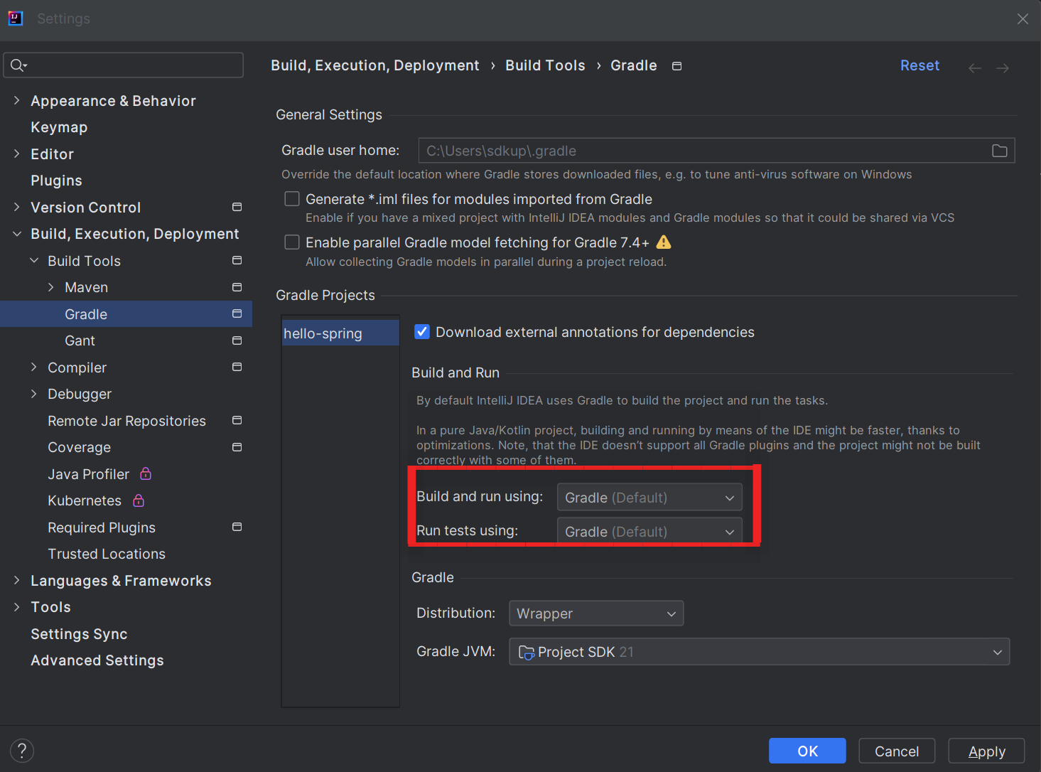 4. 아래 빨간 네모창대로 자바 버전 설정하고, IntelliJ IDEA 로 Build and run 설정( gradle로 하면 빌드 속도가 느려짐)